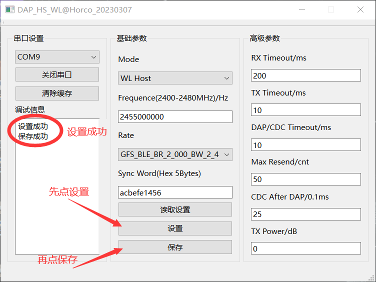 拔下USB线,按住按键B,USB重新连接电脑,此时指示灯为黄色。查看设备管理器中对应的COM口,打开上位机软件,按照下图标注进行配对设置。之后如果需要重新配对等,与这步相同。